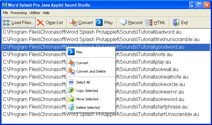 to manually play, convert WAV files to the AU format, and copy, move or delete